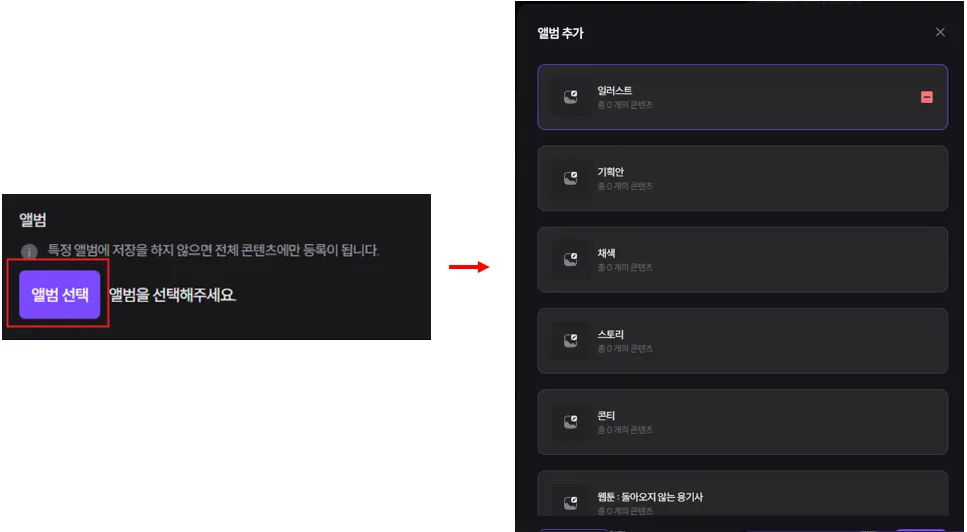 원하는 앨범을 생성하고 해당 앨범에 나의 콘텐츠를 추가할 수 있습니다.