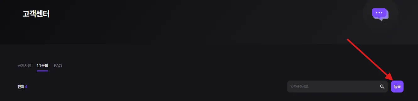 로그인 후 > 오른쪽 상단 [메뉴 버튼] > 고객센터 > 1:1 문의 탭의 등록 버튼을 눌러주세요.